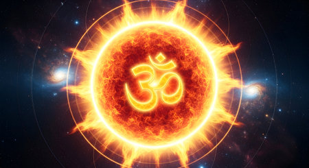 A Fiery Om Symbol Inside Glowing Sun in Cosmic Galaxy Space, Hindu Spiritual Energy Concept Representing Divine Light, Power, and Universal Consciousness