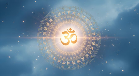 A Hindu spiritual Om symbol glowing with divine light in the center of Sanskrit alphabet chakra representing cosmic energy meditation power and sacred sound in Indian culture