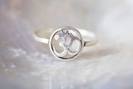 Silver ring tiny jewelry piece on white pearl background in the shape of om