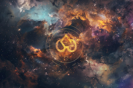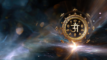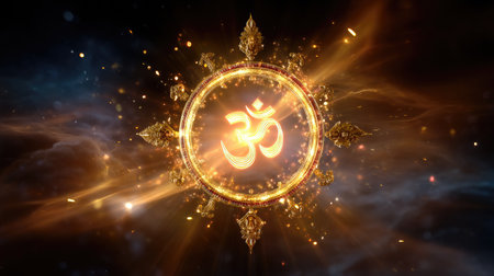 This captivating image features an intricate Om symbol in gold, surrounded by an enchanting cosmic backdrop filled with light effects and stars. Perfect for themes of spirituality and creativity.