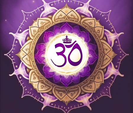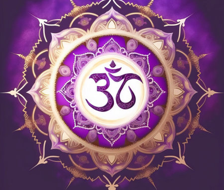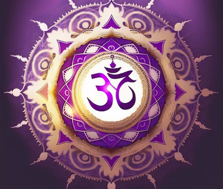 mandala with om symbol in the center on a background decorated in purple and gold. meditation, zen image for relaxation, feng shui created with Generative AI technology