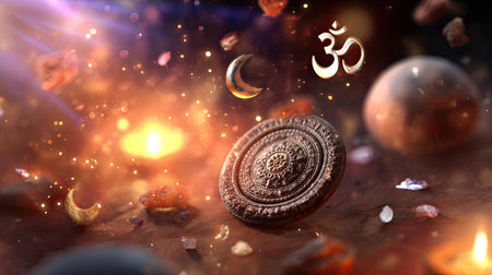 A stunning visual featuring a mystical shield surrounded by cosmic elements and symbols. This captivating scene radiates energy and spirituality.