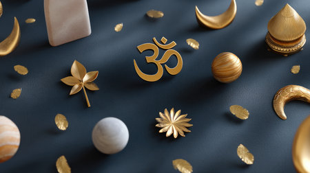 A collection of golden spiritual symbols and decorative elements arranged on a dark background, creating a serene and tranquil atmosphere ideal for meditation and mindfulness themes.