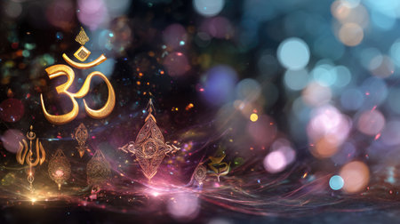This captivating abstract image showcases sacred symbols in a vibrant array of bokeh lights, fostering a sense of spirituality and artistic harmony.