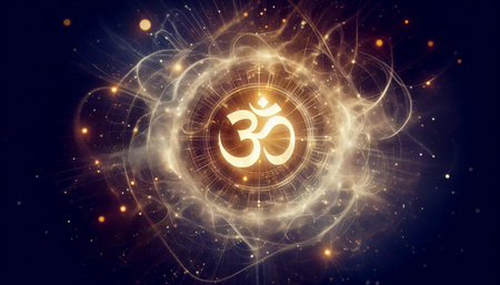 A captivating image featuring the Om symbol at the center of a golden mandala, surrounded by shimmering lights, invoking peace and serenity.