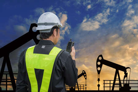 Civil engineer checking work with walkie-talkie for control and management in the oil rig.
