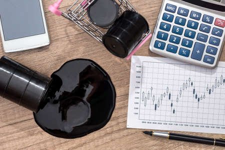 Oil trend down. Candle graph chart Oil barrels and a financial chart on abstract business background. Price oil down. Barrel arrow down.