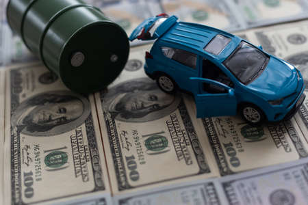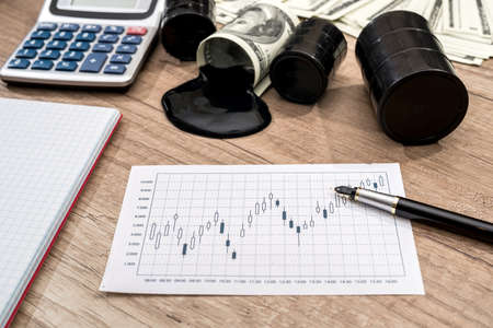 black barrel with oil lies on dollar banknotes with calculator on desk. Sale of oil. Oil