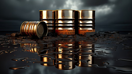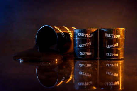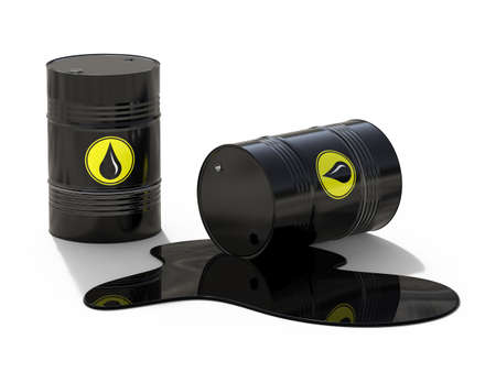 Black metal barrels and spilled oil. Concept of pollution. Ecology and business. 3D illustration.