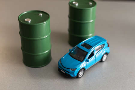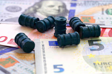 barrels of oil standing on the dollar bills of money. the oil business, purchase sale, production, exchange, trading income.