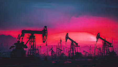 Silhouette of many oil pumps at sunset against a vibrant pink and red sky. The scene depicts a large industrial complex for oil extraction in the foreground and mountains are visible in the background.