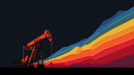 This digital artwork features an oil pump jack set against a vibrant, colorful background, symbolizing industrial energy production and modern resource extraction.