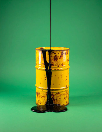 A stream of thick, black crude oil pours into a weathered yellow barrel, overflowing and spilling onto the surface. Set against a stark green background, this powerful visual symbolizes industrial waste, environmental pollution, the high cost of fossil fuels, and the complexities of the global energy market.