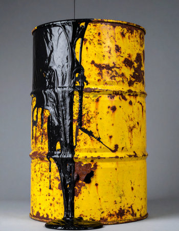 A thick, black substance, resembling crude oil or industrial waste, oozes down the side of a corroded yellow barrel. The stark contrast between the bright, decaying drum and the dark spill highlights themes of pollution, environmental neglect, and the hazardous byproducts of industry.