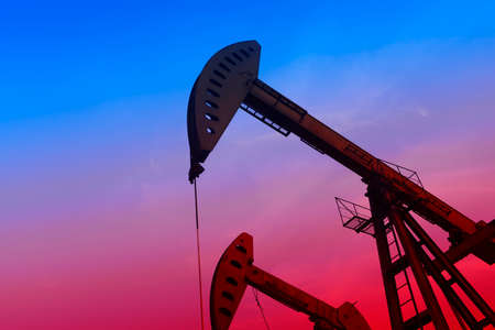 Two oil derricks stand silhouetted against a vibrant sky with shades of pink, orange, and blue. The image showcases the industrial structures, possibly suggesting energy production or petroleum extraction. The photograph is likely suitable for commercial applications, illustrating themes of industry, natural resources, and environmental concepts.