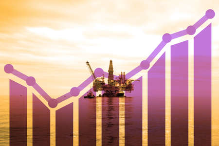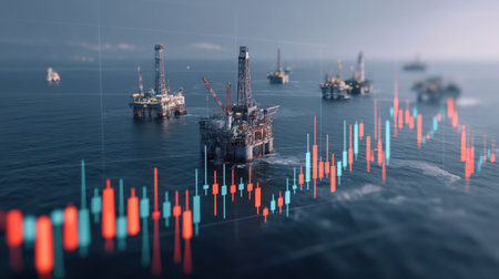 This dynamic stock image showcases oil rigs in ocean waters with a financial chart overlay, symbolizing trends in the energy sector. Perfect for finance and energy themes.