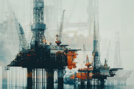 Several oil drilling platforms rise above the water on a foggy morning. The towering structures and cranes illustrate the complexity of offshore energy extraction.
