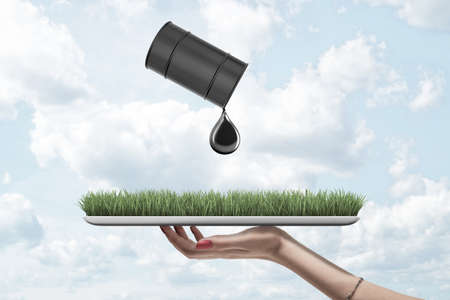 Womans hand holding patch of green lawn on metal tray with black barrel of oil tipped in the air spilling big drop of oil on grass.
