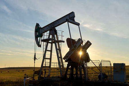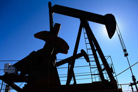 Oilfield pumpjack, rusty and old, silhouetted by the sun.