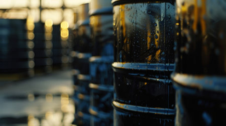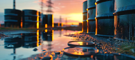 Stacked oil barrels sit outside an industrial plant as the sun sets, casting a warm glow on the barrels and reflecting in a puddle of water on the ground.