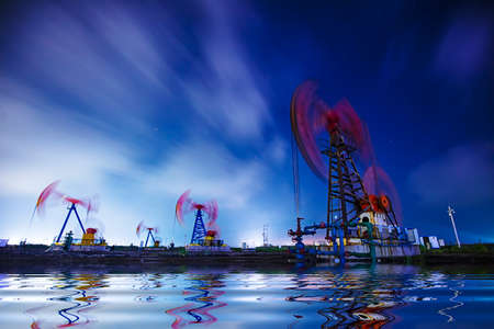 Oil pumping machinery in operation, crude oil extraction scene in the night, North China