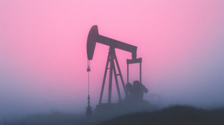Industrial oil pump jack extracting crude oil from a well in a foggy landscape at sunset, symbolizing energy production, fossil fuels, and environmental impact