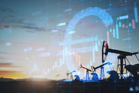 Abstract backlit oil pumping equipment on sky background with glowing growing forex chart with euro sign and mock up place. Trade, finance and economy concept. double exposure