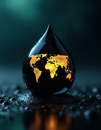 Oil droplet falling from a fuel nozzle against a stock market background with rising trends and graphs in a financial context