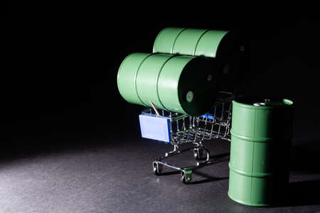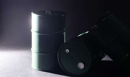 Oil and gas industry. Black color petrol barrel on black background. Petroleum production and market. 3d render