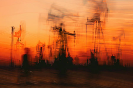 Abstract blurred image of oil pumps at sunset, showcasing the motion and dynamic energy of the oil industry against a colorful sky.