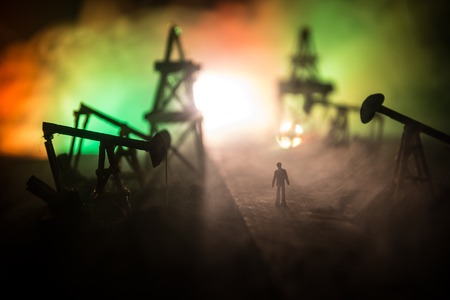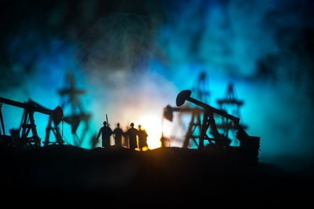 Artwork decoration. Oil war concept. Military silhouettes at oilfield with pumps and rigs. Misty colorful sky background. Armored vehicles fighting scene. Selective focus