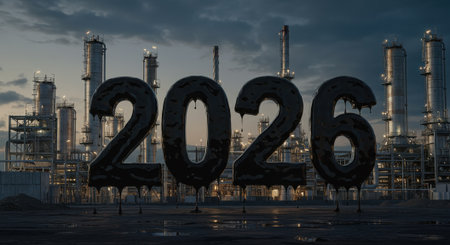 A conceptual and thought-provoking visual depicting the year 2026 with numbers that appear to be made of dripping crude oil, set against the backdrop of an oil refinery. This powerful composition raises questions about the global economy's dependence on fossil fuels, energy markets, and the environmental impact of industry in the year 2026. A striking metaphor for themes of energy policy, the economy, climate change, and the industrial world.