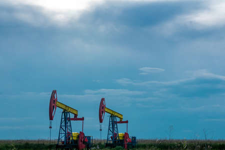 pumpjacks piston pumps operating at an oil well in field under cloudy sky
