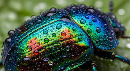 Close-up of an iridescent beetle on a leaf, surrounded by dew drops, capturing the natural beauty and vibrant colors of the insect in a serene setting.