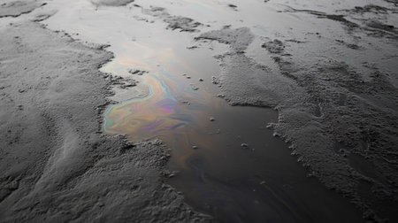 Colorful iridescent oil slick on a textured dark surface, showcasing vibrant patterns and shimmering hues. Nature and environmental concept, focusing on fluid dynamics.