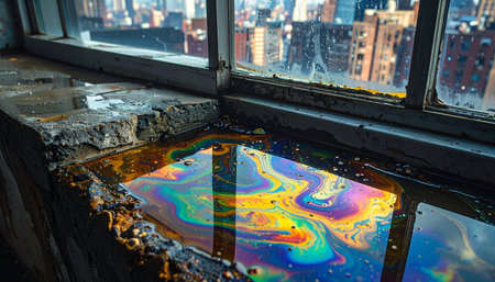 In a forgotten room high above the bustling city, a chemical spill creates a mesmerizing, psychedelic puddle on a decaying windowsill.