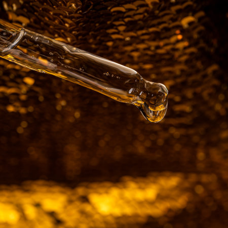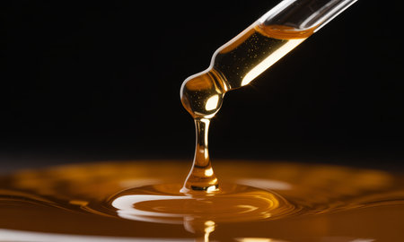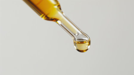 A delicate glass dropper gently releases a shimmering, honey-colored droplet against a smooth gray backdrop, ideal for highlighting beauty and wellness products.