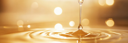 A luminous golden droplet elegantly disturbs a tranquil surface, forming delicate ripples amid a glow-lit backdrop adorned with twinkling bokeh highlights in gentle focus