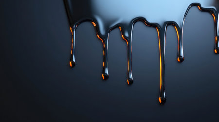Thick black liquid drips in uneven strands from a horizontal line onto a rough, textured background. Abstract and moody.