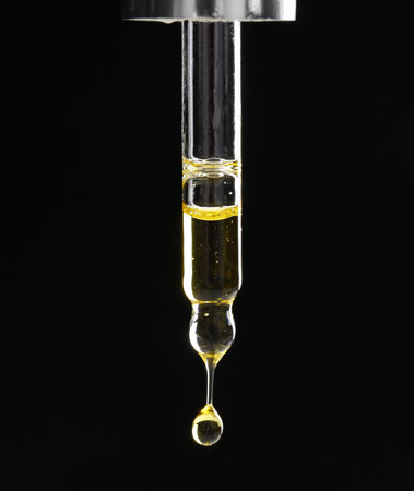 Essential oil dripping from pipette on black background