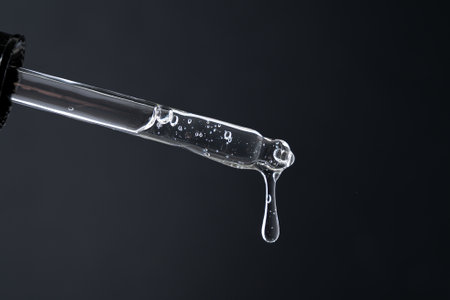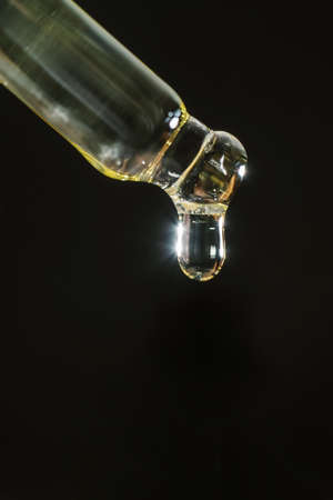 Pipette with liquid transparent gel, serum or essential oil on black