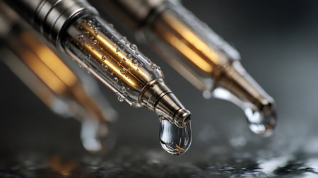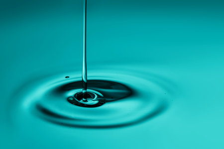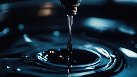 A clear droplet descends from a slender glass instrument into tranquil blue waters, producing soft ripples and shimmering reflections that evoke serenity and precisi