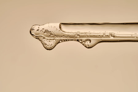 The texture of the serum flowing out of the pipette on a beige background.