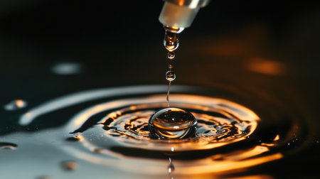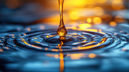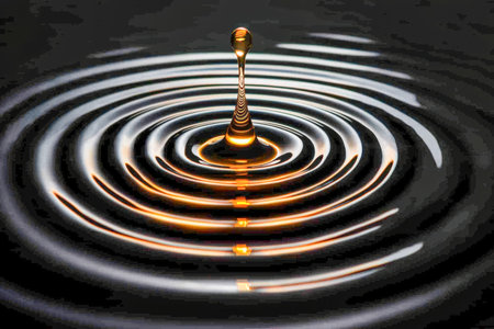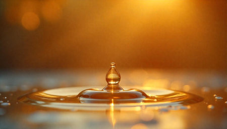 Golden water droplet impact creates ripples in a liquid