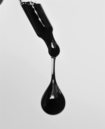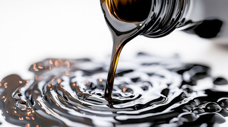 A detailed shot capturing thick, dark motor oil streaming from a container onto a shiny mirror-like pan, highlighting rich texture and glossy sheen.