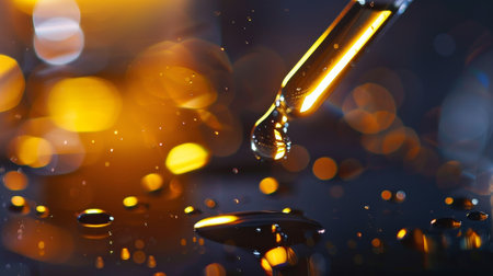 Transparent serum pipette with drops on dark background with gold light blurred and bokeh. Cosmetic greeting concept. Minimalism style and extreme close up.