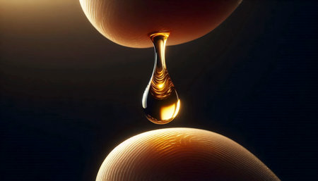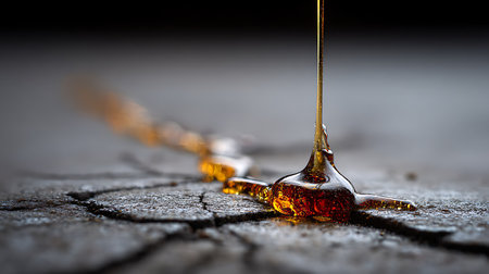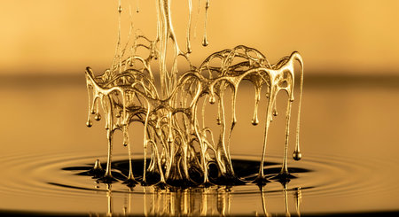 A thick, golden liquid flows down onto a reflective dark surface, creating intricate patterns and ripples. The warm tones of the fluid stand out against the contrasting backdrop, hinting at viscosity and smooth movement