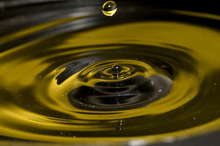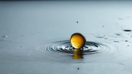 A tiny water ball impacts a dark pool, sending outward waves and subtle reflections, capturing tranquility and dynamic motion in nature.