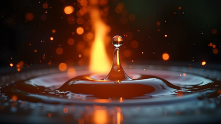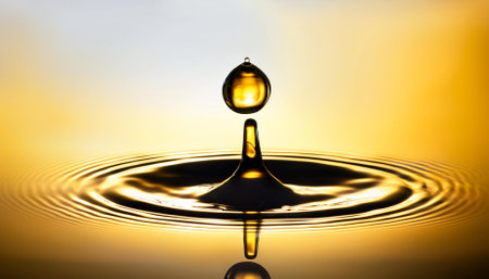 A luminous golden droplet elegantly disturbs a tranquil surface, forming delicate ripples amid a glow-lit backdrop adorned with twinkling bokeh highlights in gentle focus