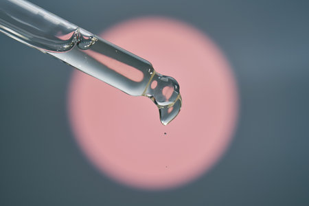 Oli drop on pipette on white background, macro. Close-up face moisturizer in glass dropper with copy space. Skincare beauty product and texture
